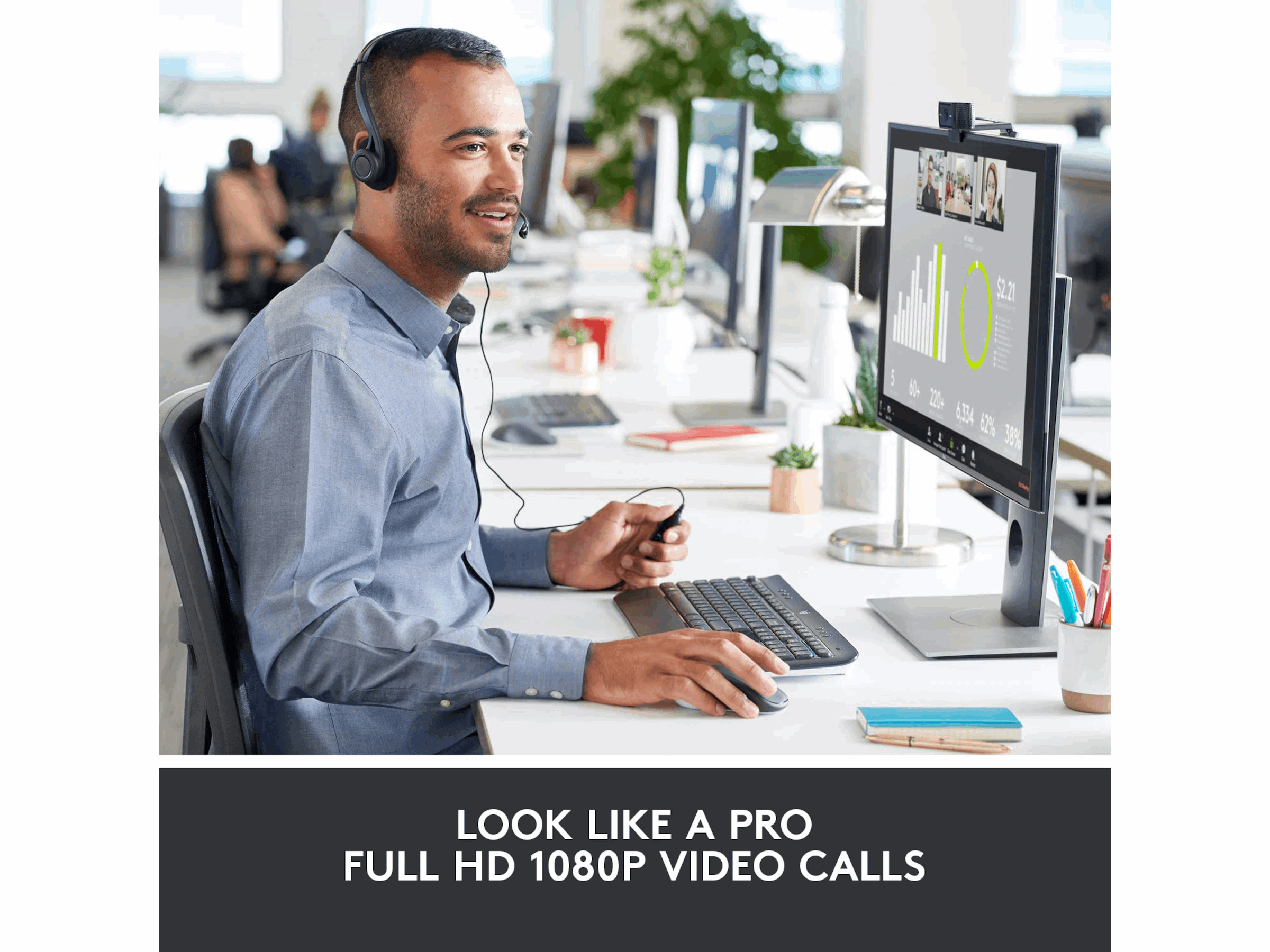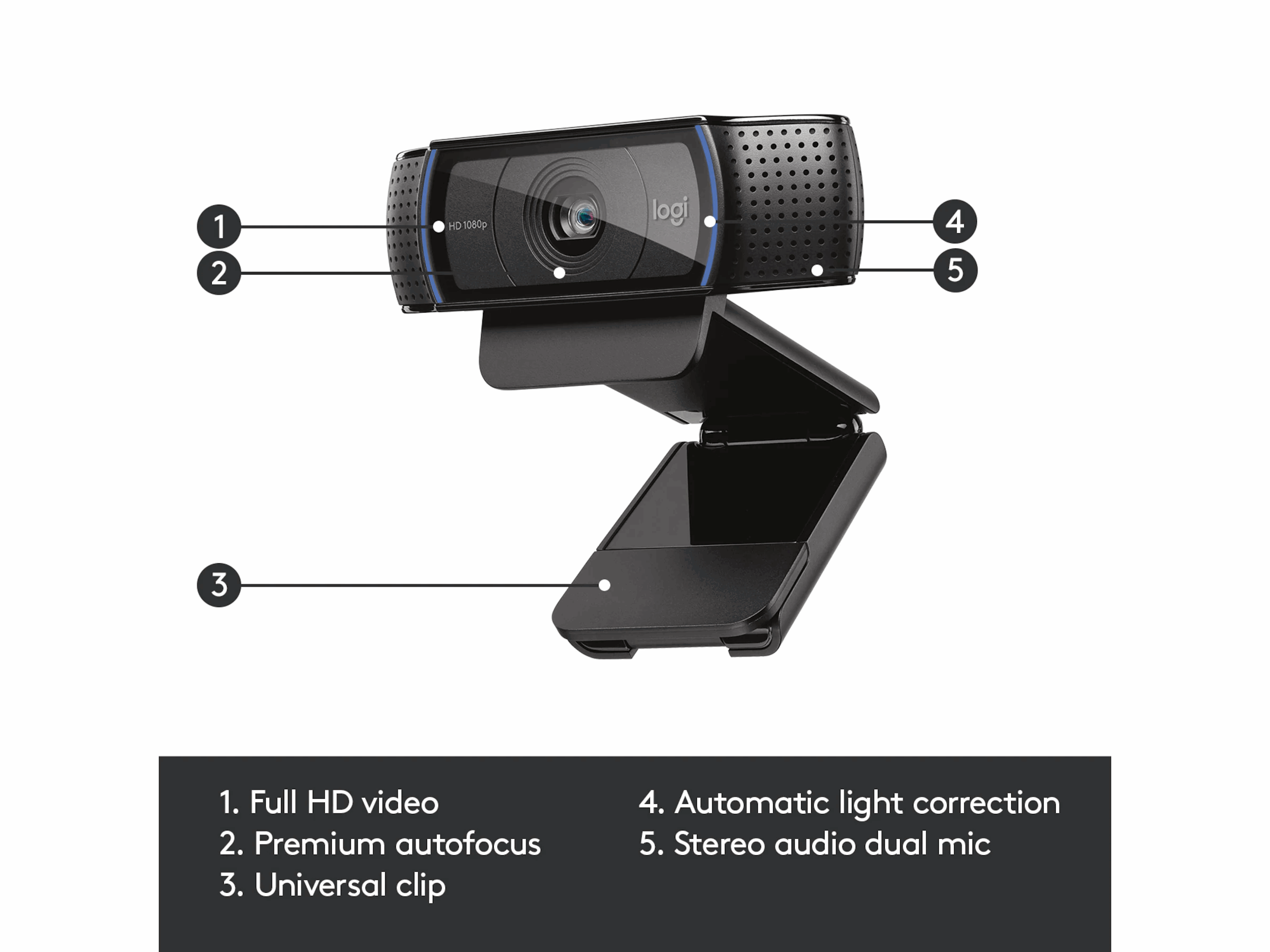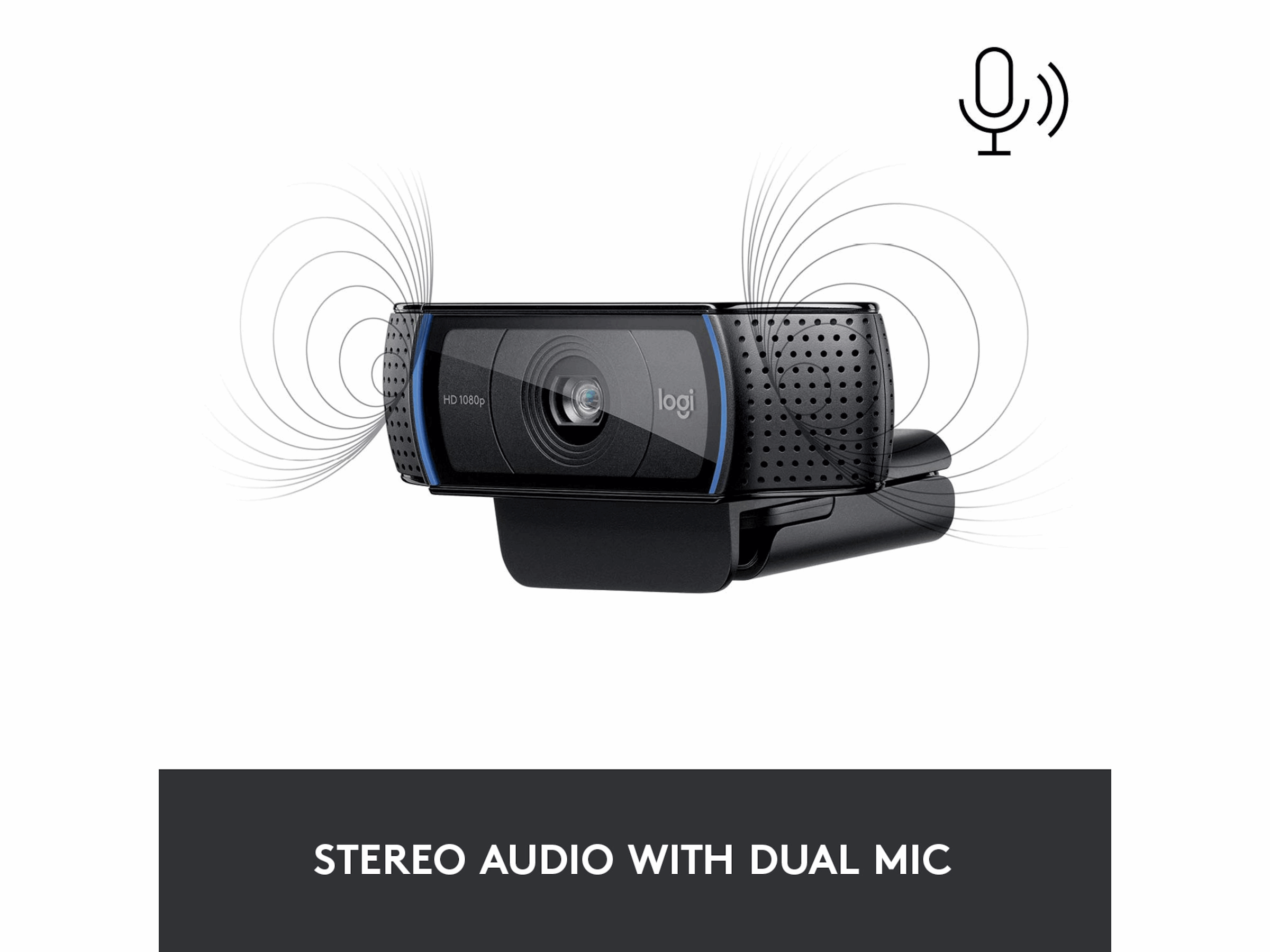 Du kan også glede deg over klarheten og detaljene takket være glassobjektivet for full-HD og førsteklasses autofokus. Og med to mikrofoner, på hver side av webkameraet for å fange virkelighetstro stereolyd, kan du kan være sikker på at alle hører deg, høyt og tydelig